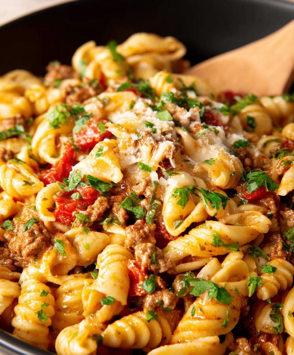 Our Cheesy Taco Pasta Salad recipe demands two steps: al dente rotini and simmered, zesty ground beef. It’s cheesy, savory, and ready fast.