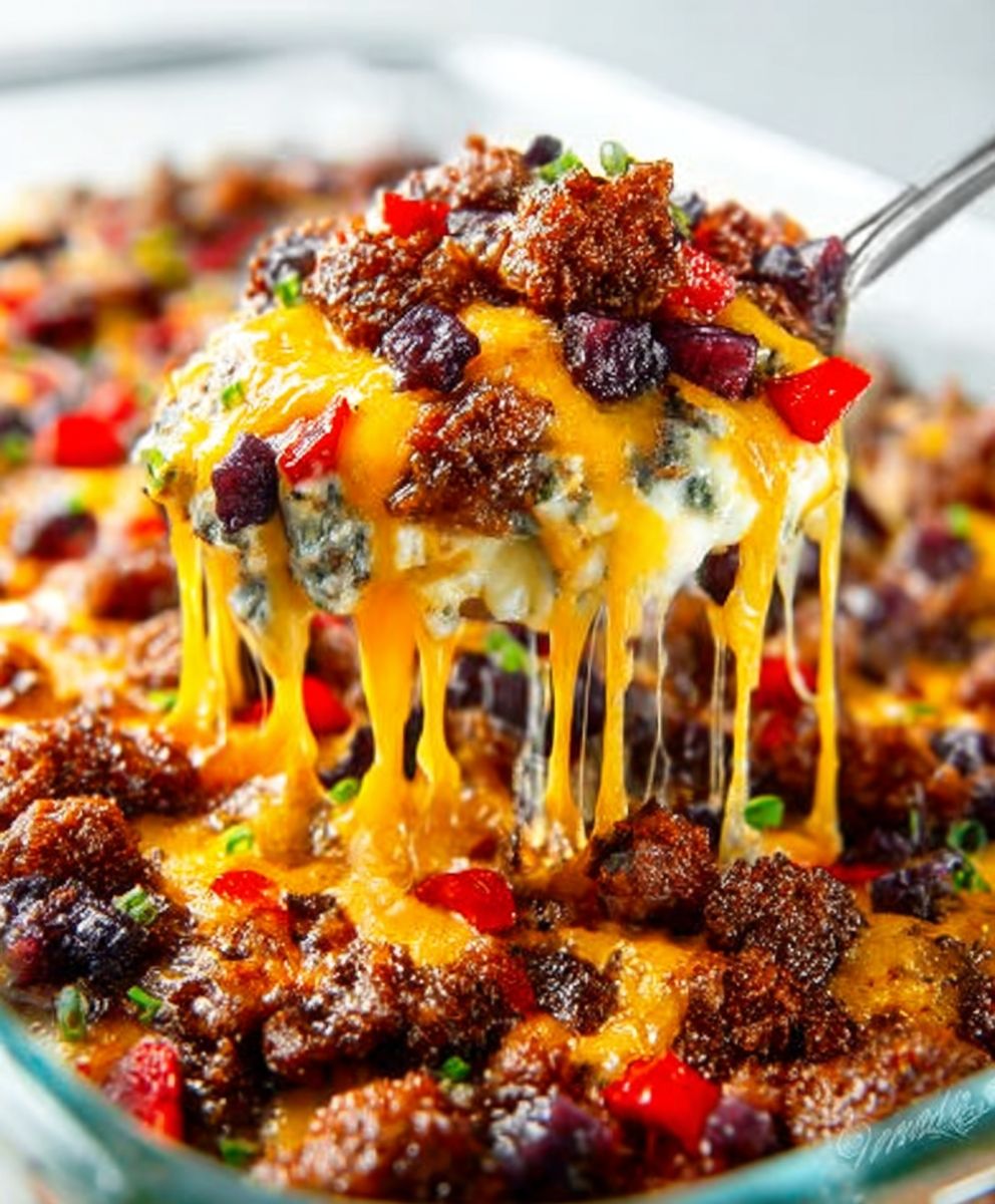 - Top with Cheese:Carefully spread the creamy cheese mixture over the turkey layer. Sprinkle the remaining 1 cup of shredded cheddar cheese over the top.